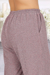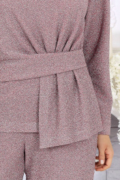 6070 Комплект брючный Это не просто наряд — это ваша уверенность, статус и блеск, который будет сопровождать каждый ваш шаг. В этом костюме каждая деталь продумана так, чтобы создавать ощущение безупречного стиля и лёгкой роскоши. Мягкое мерцание люрекса делает образ выразительным и дорогим, а утончённый крой подчёркивает женственность и гармонию силуэта. Блузка с асимметричной деталью по линии талии — это модный акцент, который визуально формирует стройный силуэт и придаёт образу дизайнерскую изысканность. Нежная линия декольте в обрамлении округлой горловины элегантно подчёркивает женственность. Брюки прямого силуэта с комфортной посадкой — символ утончённой простоты и свободы. Эластичный пояс обеспечивает удобство, а мерцающая фактура ткани делает их достойным элементом вечернего гардероба. Такой костюм создан для особых случаев: новогодних вечеров, корпоратива, праздничного ужина или выхода в свет, но при этом он настолько универсален, что легко впишется и в деловой стиль. Комплект брючный 2-х предметный, состоящий из блузки и брюк. Блузка полуприлегающего силуэта, выполнена из трикотажного полотна с фактурной лицевой стороной «люрекс». Модель без подкладки, с плечевыми накладками. Спинка с талиевыми вытачками и средним швом. По линии талии в левой части переда – горизонтальный подрез с односторонними складками и отлетной деталью в шве. По линии талии в правой части переда обработан цельнокроеный пояс, край которого крепится в левом боковом шве. Горловина округлая, углубленная спереди. Рукав длинный, втачной. Длина блузки – 62 см (50-58 р-р), 64 см (60-64 р-р); длина рукава – 57 см (50-58 р-р), 58 см (60-64 р-р). Брюки длинные, с посадкой на талии, выполнены из трикотажного полотна с фактурной лицевой стороной «люрекс». Модель без стрелок, без застежки. Спереди обработаны наклонные боковые карманы. Для лучшего прилегания по линии талии в притачном поясе предусмотрена эластичная лента, вставленная по всей длине. Длина брюк по боковому (с поясом) – 106 см (50-52 р-р), 107 см (54-58 р-р), 108 см (60-64 р-р).