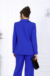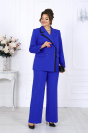 6086 Костюм брючный Элегантный брючный костюм двойка — идеальный выбор для деловых встреч, офисных будней, торжеств и вечерних выходов. Костюм подходит для женщин с формами: он формирует правильный силуэт, подчеркивая достоинства и создавая стройный образ. Двубортная застежка со смещением и декоративной вставкой создаёт эффект многослойности, придавая образу стильный акцент. Универсальная модель — одинаково уместна как на работе, так и на торжественном мероприятии. Костюм брючный 2-х предметный, состоящий из жакета и брюк. Жакет двубортный, полуприлегающего силуэта, выполнен из костюмной поливискозы. Модель на подкладке, с плечевыми накладкам. Спереди обработаны рельефные швы, направленные от пройм до низа; в нижней части переда расположены прорезные карманы с клапаном, в верхней, слева – имитация прорезного кармана с листочкой. Перед со смещенной внешней застежкой на 2 декоративные пуговицы и внутренней на 2 потайные. Спинка со средним швом. Воротник пиджачного типа. Рукав длинный, втачной. Правая сторона жакета дополнена декоративной вставкой, имитирующей двойную деталь переда. Длина жакета - 68 см; длина рукава - 61 см. Брюки классические, с кантами и посадкой на талии, выполнены из костюмной поливискозы. Модель с центральной застёжкой на тесьму-«молнию», на притачном поясе, застегивающемся на петлю и пуговицу. Передние и задние половинки брюк с талиевыми вытачками, направленными от пояса вниз. Спереди обработаны боковые наклонные карманы. Для лучшего прилегания брюк в области талии в поясе по задним половинкам вставлена эластичная лента. Длина брюк по боковому (с поясом)-107 см (50-52 р-р), 108 см (54-58 р-р).