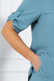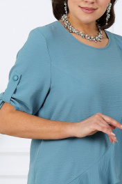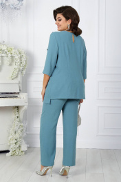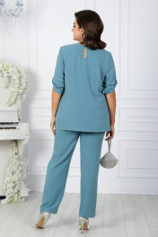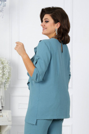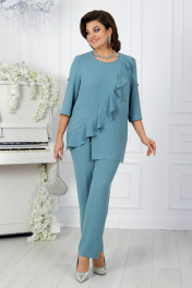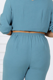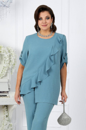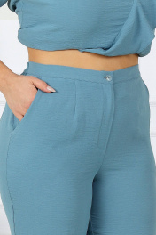 7440 Комплект брючный Этот женский костюм — идеальный выбор для летних дней, выполнен из легкой однотонной ткани, обеспечивая комфорт и стиль. Сочетание легкой ткани, изящного дизайна блузки с воланом и классических брюк делает этот костюм универсальным решением для различных событий. Он подходит как для офисного дня, добавляя деловой шик вашему образу, так и для торжественного мероприятия, придавая вам элегантности и утонченности. Комплект брючный 2-х предметный, состоящий из блузки и брюк, выполненных из ткани креп. Блузка полуприлегающего силуэта, длиной по середине спинки 67 см. Перед с нагрудными вытачками, выходящими из пройм, с фигурным подрезом с притачным воланом, идущим из левого плеча, и уходящим в низ, в правый боковой шов. Срез волана обработан узким "московским" швом. Перед с ассиметричным низом: левая боковая часть переда длиннее спинки по левому боковому шву на 5 см. Левая и правая части переда по низу образуют А-образный разрез. Спинка с талиевыми вытачками, с фигурным разрезом "капля", идущим от горловины вниз, застегивающийся на 1 навесную петлю и 1 пуговицу. Горловина спинки округлой формы, по переду округлая, углубленная. Срезы горловин переда, спинки и разреза "капля", окантованные. Рукава втачные, одношовные, с настрочными патами, застегивающимися на 1 петлю и 1 пуговицу. Длина рукавов 42 см. Рукав по длине может регулироваться с помощью паты. Блузка с плечевыми накладками. Брюки классические, с посадкой на талии, на притачном поясе, с застёжкой на тесьму-«молния», расположенную в среднем шве передних половинок, 1 петлю и 1 пуговицу на поясе. Передние и задние половинки брюк с талиевыми вытачками, идущими от пояса вниз, с боковыми наклонными карманами на передних половинках. Для лучшего прилегания брюк в области талии в поясе со стороны спинки вставлена резинка.