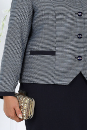 7457 Костюм женский Этот костюм выполнен из премиальной турецкой ткани, сочетает в себе офисный и деловой стиль с элементами праздничного наряда. Он идеально подходит для работы в офисе, деловых встреч и официальных мероприятий, при этом сохраняя возможность использовать его для торжественных случаев. Костюм женский, состоящий из жакета и юбки, жакет выполнен из костюмно - плательной ткани «рогожка», юбка выполнена из костюмно – плательной ткани. Жакет женский прилегающего силуэта, длиной по среднему шву спинки 57 см. Перед с фигурной кокеткой, из однотонной ткани, с рельефными швами от кокетки до низа, проходящими через центр груди, с прорезными карманами с листочной, из однотонной ткани, с центральной, бортовой застежкой на 5 петель и 5 пуговиц, край борта фигурной формы. Спинка со средним швом и с рельефными швами от пройм до низа. Горловина спинки и переда округлая. Рукав втачной, двушовный, с притачной манжетой из однотонной ткани. Длина рукава с учетом притачной манжеты 60 см. Жакет на подкладке, с плечевыми накладками. Юбка полуприлегающего силуэта, зауженная к низу, на подкладке, на притачном поясе с внутренними резинками между передними и задними вытачками, с застежкой на 1 петлю и 1 пуговицу. Переднее полотнище с талиевыми вытачками. Заднее полотнище с талиевыми вытачками и средним швом, в верхней части которого обработана застежка на потайную тесьму-молнию, в нижней части- шлица. Длина юбки по боковому шву с учетом пояса 65 см.