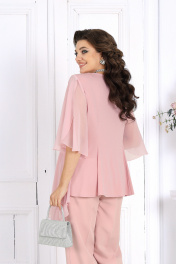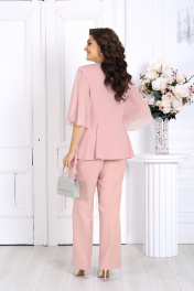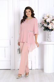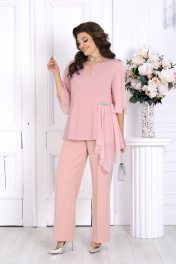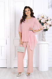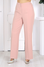 7512 Комплект брючный Этот костюм сочетает в себе женственность, комфорт и безупречный крой, подчеркивающий фигуру и скрывающий возможные нюансы. Воздушная блузка выполнена из мягкого трикотажа «масло» и дополнена асимметричной шифоновой деталью, создающей красивый драпирующийся силуэт. Украшение в виде страз и изящный вырез «капля» добавляют образу благородного блеска и утонченности. Легкий рукав формы «крылышко» дарит ощущение свободы и легкости движений. Классические брюки со стрелками идеально садятся по фигуре благодаря эластичной вставке в поясе и мягкой посадке на талии. Этот костюм отлично подходит для женщин с пышными формами — подчеркивает достоинства, визуально вытягивает силуэт и делает образ торжественным и уверенным. Идеален для новогодних праздников, юбилеев, вечеринок и торжеств. Комфортный и нарядный — он станет вашей любимой праздничной двойкой! Комплект брючный 2-х предметный, состоящий из блузки и брюк. Блузка полуприлегающего силуэта, выполнена из трикотажного полотна «масло». Модель без воротника и застежки. На переде и спинке обработаны рельефные швы, направленные от проймы до низа. На левой боковой части переда – горизонтальный подрез с отлетной деталью из шифона. Шов подреза декорирован тесьмой со стразами. Горловина круглой формы, окантована косой бейкой из основного полотна; спереди декорирована стразами и дополнена вырезом «капля». Рукав короткий, формы «крылышко на запах», со скругленными срезами; выполнен из шифона. Длина блузки – 57 см; длина рукава – 41 см. Брюки классические, длинные, с посадкой на талии, выполнены из костюмно- плательной ткани. Модель со стрелками. Передние и задние половинки брюк с талиевыми вытачками, направленными от пояса вниз. Спереди обработаны наклонные боковые карманы и центральная застёжка на тесьму-«молнию». Притачной пояс застегивается на 1 петлю и 1 пуговицу; для лучшего прилегания по линии талии в притачном поясе предусмотрена эластичная лента, вставленная по спинке. Длина брюк по боковому (с поясом) -- 107 см.
