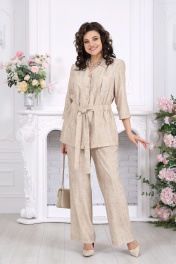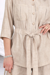 7520 Комплект брючный Брючный костюм — комфорт, который выглядит элегантно Этот комплект словно создан для тех дней, когда хочется выглядеть безупречно, не жертвуя удобством. Легкий, дышащий, пластичный — он мягко повторяет движения и подчеркивает естественную красоту силуэта. Блузка с аккуратным воротником и деликатной застежкой создает ощущение собранности и стиля, а пояс по линии талии позволяет подчеркнуть фигуру так, как хочется именно вам. Накладные карманы добавляют образу современности и легкой расслабленности. Брюки завершают комплект — прямые, струящиеся, они визуально вытягивают силуэт и дарят ощущение свободы в каждом шаге. Вискозное «крэш»-полотно — это баланс между натуральностью и практичностью. Оно легкое, дышащее, приятно к телу и не требует идеальной глажки, сохраняя эффект стильной фактурности. Комплект брючный 2-х предметный, состоящий из блузки и брюк. Блузка прямого силуэта, выполнена из вискозного полотна. Модель с втачным рукавом ¾ и плечевыми накладками. Перед с застежкой по притачной планке на 6 петель и 6 пуговиц. Горловина оформлена отложным воротником. Перед блузки с накладными карманами по линии груди. По линии талии спинки и частично переда с изнанки настрочена кулиса с широкой эластичной лентой внутри. По талии переда настрочен пояс. Длина блузки – 70 см (50-58 р-р); длина рукава (от горловины) – 44 см (50-52 р-р). Брюки длинные, прямого силуэта, с посадкой на талии, выполнены из вискозного полотна. Модель без стрелок, без застежки, с наклонными боковыми карманами, на притачном поясе с эластичной лентой внутри. Спереди обработаны наклонные боковые карманы. Длина брюк по боковому (с поясом) – 107 см (50-58 р-р).