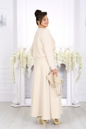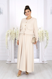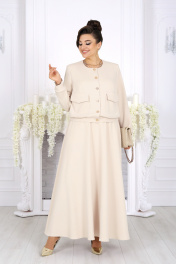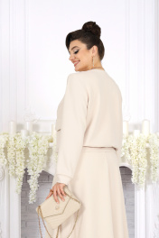 7522 Комплект женский Этот универсальный костюм легко адаптируется под разные поводы: носите его целиком для праздничных мероприятий или комбинируйте элементы между собой для создания деловых и повседневных образов. Благородный оттенок и лаконичный дизайн делают модель актуальной вне времени и сезонов. Идеальный выбор для женщин plus size, которые хотят выглядеть элегантно, современно и чувствовать себя комфортно каждый день. Комплект женский 3-х предметный, состоящий из жакета, блузки и юбки. Жакет однобортный, прямого силуэта, выполнен из поливискозного трикотажного полотна. Модель на притачном поясе, без подкладки, с плечевыми накладками. Перед с центральной внешней застежкой на 6 петель и 6 декоративных пуговиц; в верхней части переда обработаны нагрудные вытачки, направленные от пройм, в нижней части настрочены накладные карманы с клапаном. Горловина круглой формы, углубленная спереди. Рукав длинный, втачной, на притачной манжете без застежки. Длина жакета – 53 см; длина рукава – 62 см. Блузка полуприлегающего силуэта, выполнена из вискозного трикотажного полотна. Горловина округлой формы, углубленная спереди. Срезы горловины и пройм окантованы косой бейкой. Длина блузки – 61 см. Юбка-полусолнце, с посадкой на талии, выполнена из поливискозного трикотажного полотна. Модель на трикотажной подкладке. В среднем шве заднего полотнища обработана застежка на потайную тесьму-«молнию» (20 см). Притачной пояс застегивается по спинке на 1 петлю и 1 пуговицу; для лучшего прилегания по линии талии предусмотрена эластичная лента, вставленная в пояс над боковыми швами. Длина по боковому (с поясом) - 95 см.