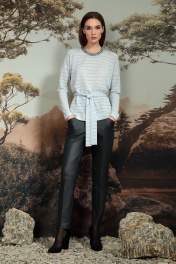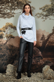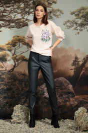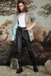 Брюки из эко-кожи темно-синего цвета. Брюки длиной до косточки, зауженные книзу. По переду фигурная кокетка, карманы и заутюженные канты. Сзади брюки с прорезными карманами. Изделие на поясе. Средняя посадка. Брюки очень хорошо тянутся.