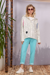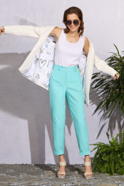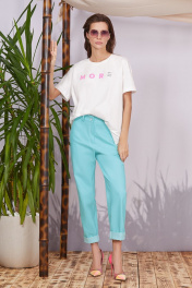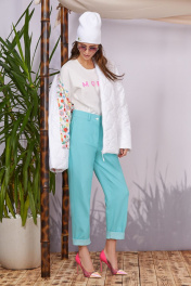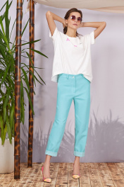 Цвет изделия Морская волна ( бирюза) Джинсы прямые, немного зауженные книзу длиной до косточки. Изделие на поясе, карманы в рамку на передних половинках, фигурная кокетка и накладные карманы сзади. Брюки отлично сочетаются с джемперами и свободными рубахами, а так же прекрасно дополняют образ в сочетании со свободным жакетом в стиле Casual. Длина изделия 103см