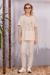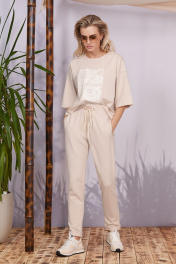 Цвет-песок Спортивные брюки из хлопкового футера 3-нитки, свободного кроя сверху и зауженные книзу. На передних половинках прорезные карманы с листочкой и эластичный широкий пояс-резинка, в который вставлен декоративный шнур и нашивка из натуральной кожи niv niv. На правой задней половинке брюк имитация прорезного кармана. Низ брюк на манжете. Длина изделия 101см