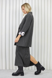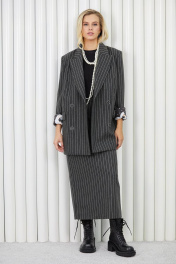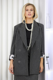 Цвет Лавовый дым (Цвет Цвет Pantone 18-2024) Удлиненный жакет прямого силуэта на вискозной авторской подкладке. Жакет прямой, выполнен по типу “мужской пиджак”. Изделие с двубортной застежкой на пуговицы. Воротник пиджачного типа. На полочках нагрудные вытачки, прорезные карманы в рамку и клапаны. Борта прямые. Спинка прямая. Строгая, прямая, чуть удлиненная линия плеча. Рукав длинный.