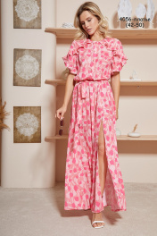 Цвет- “Вереск” Стильное шифоновое платье, длина макси. Изделие отрезное по линии талии. Застежка центральная, до линии подреза, на петли пуговицы. Низ платья на резинке с декоративным разрезом. Спинка прямая. Горловина круглая. Сложный комбинированный покрой рукава. В подрез и по низу рукава вставлены декоративные воланы, которые собраны на сборку. В комплекте съемный пояс из основной ткани.