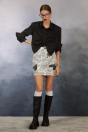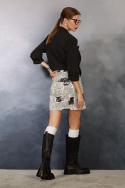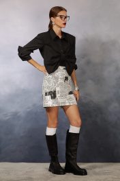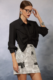 Цвет- “Воронье крыло” Стильная блуза эксклюзивного дизайна, прямого силуэта из хлопка. Длина чуть ниже линии талии, что позволяет заправить блузу. Центральная застежка на петли и пуговицы. Строгая, чуть удлиненная линия плеча, свободный рубашечный рукав, снизу на притачной манжете. Спинка прямая с вытачками. Рубашечный воротник на стойке. Декоративный съемный бант спереди.