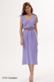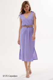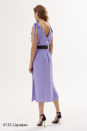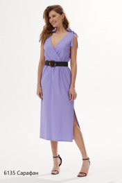 Стильный сарафан на бретелях длины миди. Лиф переда и спинки на запах. Отрезная часть юбки по линии талии на сборке, что придаёт образу легкость. Линия талии декорирована ремнем. Состав: Тенсел 100%