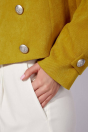 жакет женский двубортный, укороченный , прямого силуэта из мягкой ткани в рубчик с небольшим ворсом. Горловина обработана воротником и лацканами пиджачного типа., застегивается на 4 петли и пуговицы. Спереди в области груди обработаны декоративные не функциональные карманы с листачками. Рукава втачные длинные с декоративной патой на пуговице. По спинке также обработаны декоративные паты на пуговицах. Жакет на притачной подкладке.