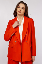 Стильный жакет современного прямого силуэта из костюмной ткани двубортный, застёгивающийся на декоративные пуговицы в натуральном стиле. Воротник пиджачного типа с отложными лацканами. Спереди обработаны прорезные карманы с клапанами. Спинка со средним швом и отлетной шлицей по низу. Рукава втачные, длинные с закрытыми шлицами по низу с застежкой на декоративные пуговицы. Изделие на подкладке.