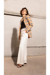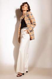 Современный блейзер полуприлегающего силуэта из трикотажа с модным дизайном в клетку, однобортный, застёгивающийся на пуговицы в натуральном стиле. Воротник пиджачного типа с отложными лацканами. Спереди обработаны прорезные карманы с клапанами. Спинка со средним швом, отрезными бочками и шлицей по низу. Рукава втачные, длинные с открытыми шлицами по низу с пуговицами. Изделие на контрастной поливискозной подкладке.