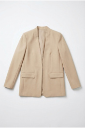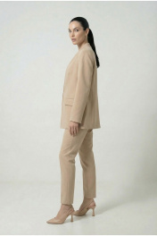 Жакет прямого силуэта из костюмной ткани, с застежкой на пришивной крючок, с воротником-стойкой по спинке, переходящим в V-образный вырез по переду. Перед с талиевой вытачкой, отрезным бочком, с прорезными карманами в рамку с клапаном. Рукав втачной двухшовный. Спинка с рельефами. Жакет на подкладке.
