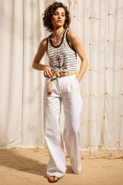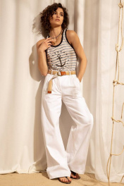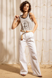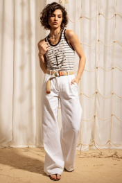 Джемпер из трикотажа в полоску с глубоким вырезом по переду. Вырез горловины и проймы обработан контрастными широкими окантовками. Джемпер дополнен декоративной печатью.