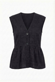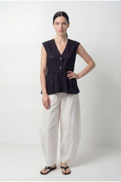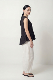 Блузка с отрезной фигурной баской, с застежкой на две пуговицы, слегка спущенным плечом. Баска с небольшой сборкой.