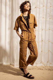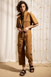 Стильный комбинезон. Лиф комбинезона прямого силуэта с большими накладными карманами и застежкой на кнопки по планке. Рукава втачные, длиной до локтя. Спинка с горизонтальной кокеткой по линии лопаток , средним швом и небольшими складками от пояса. Пояс на кулиске. Брюки комбинезона прямые с горизонтальными подрезами. Карманы спереди боковые наклонные и двумя накладными карманами с клапанами на.
