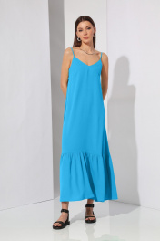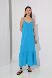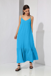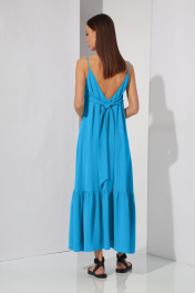Платье женское А-образного силуэта, на бретелях, с открытой спинкой. Выполнено из ткани с содержанием вискозы, плательного ассортимента. Перед и спинка цельные, с V-образным вырезом. На переде расположены нагрудные вытачки. В боковые швы вставлен пояс. По низу платья притачен волан. Ширина изделия на уровне глубины: 42р – 42см, 44р – 44см, 46р – 46см, 48р – 48см, 50р –50см; Ширина по линии талии: 42р – 47см, 44р – 49см, 46р – 51см, 48р – 53см, 50р – 55см; Ширина по линии бедер: 42р – 54см, 44р – 56см, 46р – 58см, 48р – 60см, 50р – 62см; Длина по шлейке: 42р – 125см, 44р – 125см, 46р –125см, 48р – 126см, 50р – 127см.