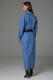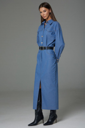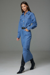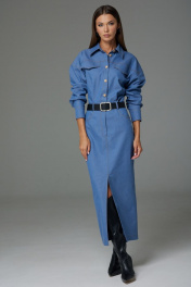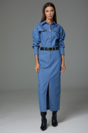 Платье женское выполнено из джинсовой ткани, полуприлегающего силуэта, покроя спущенное плечо, длинной за колено, зауженное к низу. Рукав длинный двушовный с манжетой по низу. Данное платье создает эффект блузы заправленной в юбку по талии. По переду и на спинке расположена горизонтальная кокетка, по спинке средний шов. По переду в шов притачивания кокетки вставлены клапаны. Горловина оформлена воротником стояче-отложным с отрезной стойкой. В верхней части переда расположена центрально-бортовая застежка-планка на петли-пуговицы. В области талии по спинке и по переду расположены пояс-кокетка со шлевками. Нижняя часть платья оформлена как юбка с разрезом по переду с закругленными джинсовыми карманами в бедрах и застежкой на гульфик. Ремень не входит в комплект Платье: Ширина изделия на уровне глубины: 42р – 49см, 44р – 51см, 46р – 53см, 48р – 55см, 50р – 57см, 52р – 59см. Ширина по линии талии: 42р – 33см, 44р – 35см, 46р – 37см, 48р – 40см, 50р – 42см, 52р – 44см. Ширина по линии бедер: 42р – 46,5см, 44р – 48,5см, 46р – 50,5см, 48р – 52,5см, 50р – 54,5см, 52р – 56,5см. Длина по среднему шву спинки: 42р – 135см, 44р – 135см, 46р – 135см, 48р – 136см, 50р – 136см, 52р – 136см. Ширина плеча: 42р – 21,5см 44р – 21,5см, 46р – 21,5см., 48р – 23см, 50р – 23см, 52р – 23см. Ширина рукава под проймой: 42р – 22см, 44р – 22см, 46р – 22см., 48р – 24см, 50р – 24см, 52р – 24см. Длина рукава:42р – 53см, 44р – 53см, 46р – 53см, 48р – 53см, 50р – 53см, 52р – 53см.