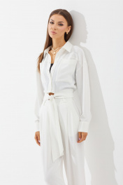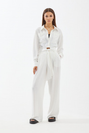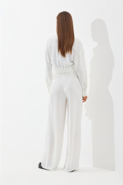 Комплект двухпредметный, состоит из бузы и брюк. Блуза свободной формы (оверсайз), покроя спущенное плечо с центрально-бортовой застежкой на планку и петли-пуговицы. Длина блузы до талии. Рукава длинные, с манжетой по низу на две пуговицы. В области груди настрочены накладные карманы. Низ блузы оформлен манжетой, по спинке в центральной части с резинкой и впереди с завязкой. Брюки прямые, свободные. Верхний срез обработан поясом, застегивающимся на одну петлю и пуговицу. На поясе шлевки. В боковых швах карманы-клапаны. Передняя половинка брюк с двумя односторонними складками. Задние полотнища с талевыми вытачками. Блуза: Ширина изделия на уровне глубины: 42р – 50см, 44р – 52см, 46р – 54см, 48р – 56см, 50р – 58см. Ширина по линии талии: 42р – 37см, 44р – 39см, 46р – 41см, 48р – 44см, 50р – 46см. Длина по среднему шву: 42-46р – 45см, 48-50р – 47см. Ширина рукава под проймой: 42-46р – 23см, 48-50р – 24,5см. Длина рукава (от горловины): 42-44р – 75 см, 46р – 76см, 48-50р – 77см. Брюки: Ширина изделия по линии талии: 42р – 34см, 44р – 36см, 46р – 38см, 48р – 40см, 50р – 42см. Ширина по линии бедер: 42р – 47,5см, 44р – 49,5см, 46р – 51,5см, 48р – 54см, 50р – 56см. Длина по боковому шву (с поясом): 42-46р – 108см, 48-50р – 109см. Ширина брючины внизу: 42р – 30см, 44р – 31см, 46р – 32см, 48р – 32см, 50р – 33см. Высота посадки: 42-46р – 37см, 48-50р – 39см.