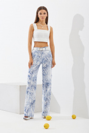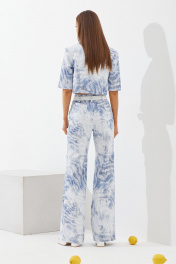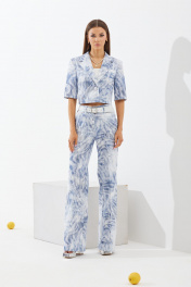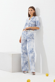 Комплект двухпредметный, состоит из жакета и брюк. В комплект не включены: ремень, топ Жакет втачного покроя с центрально-бортовой застежкой на одну пуговицу. Рукав одношовный, длиною – до локтя. Горловина оформлена воротником пиджачного типа. Жакет укорочен до талии. Спинка со средним швом и талевыми вытачками. Брюки расширенны к низу от уровня колена. В боковых швах расположены карманы. На передних половинах защипы. На задних половинах расположены накладные карманы. Застежка на тесьму-молнию. Жакет: Ширина изделия на уровне глубины: 42р – 46см, 44р – 48см, 46р – 50см. Ширина по линии талии: 42р – 42см, 44р – 44см, 46р – 46см. Ширина по линии низа: 42р – 47см, 44р – 49см, 46р – 51см. Длина по среднему шву: 42-46р – 41,5см. Длина рукав: 42-52р – 31см. Брюки: Ширина изделия по линии талии: 42р – 34см, 44р – 36см, 46р – 38см. Ширина по линии бедер: 42р – 46см, 44р – 48см, 46р – 50см. Длина по боковому шву: 42-52р – 115м. Ширина брючины внизу: 42р – 23см, 44р – 31см, 46р – 32см. Длина по внутреннему шву: 42-46р – 89см.