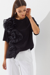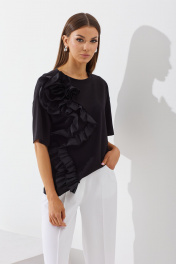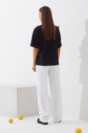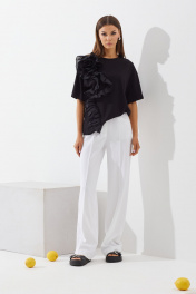 Комплект женский, состоит из блузы и брюк. Блуза выполнена из трикотажного полотна. Прямая, свободной формы, покроя спущенное плечо. Горловина округлой формы, оформлена планкой из основной ткани, рукав одношовный короткий. На правой части переда настрочена аппликация в виде цветка из отдельной ткани (текстильного хлопка в цвет модели). Брюки прямые с боковыми закругленными карманами, кокеткой на задних половинках, накладными карманами фантазийной формы. Верхний срез обработан поясом со шлевками. На передних и задних половинках отстрочены «стрелки». Блуза: Ширина по линии талии: 42р – 50см, 44р – 52см, 46р – 54см. Ширина по линии бедер: 42р – 52см, 44р – 54см, 46р – 56см. Длина по среднему шву: 42р – 62см, 44р – 62см, 46р – 62см. Ширина брючины внизу: 42р – 23см, 44р – 24см, 46р – 25см. Длина рукава: 42р – 20см, 44р – 20см, 46р – 20см. Брюки: Ширина по линии талии: 42р – 32см, 44р – 34см, 46р – 36см. Ширина по линии бедер: 42р – 46см, 44р – 48см, 46р – 50см. Длина по боковому шву: 42р – 114см, 44р – 114см, 46р – 114см. Ширина брючины внизу: 42р – 26см, 44р – 27см, 46р – 28см. Длина по внутреннему шву: 86 см.