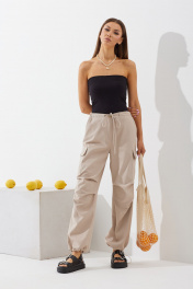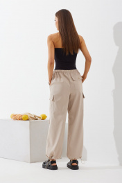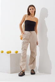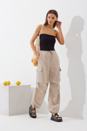 Брюки «карго», свободной формы, выполнены из хлопковой ткани. Верхний срез брюк застрочен в подгибку с закрытым срезом создавая кулису, от кармана в задней части брюк вставлена резинка, впереди вставлен шнур. В боковых швах наклонные карманы. Застежка на тесьму-молнию «гульфик». На боковых швах настрочены накладные карманы с клапаном. В области колена на детали переда заложены параллельные складки направленные вниз. По низу брюк кулиса с резинкой и фиксаторами. На правой задней половинке настрочен накладной карман с клапаном. Ширина изделия по линии талии: 42р – 31см, 44р – 32см, 46р – 35см. Ширина по линии бедер: 42р – 49см, 44р – 51см, 46р – 53см. Длина по боковому шву: 42-46р – 148см. Ширина брючины внизу: 42р – 27см, 44р – 28см, 46р – 29см.