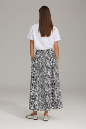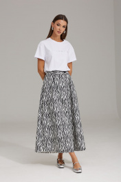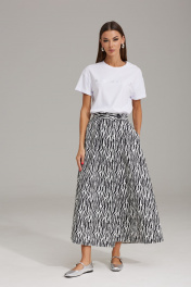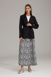 Комплект женский, состоящий из жакета и юбки, выполнен из двух видов ткани. Жакет на подкладке, полуприлегающего силуэта, втачного покроя с центрально-бортовой застежкой на петли-пуговицы. Горловина оформлена воротником пиджачного типа. Рукав двухшовный, полной длины. По переду расположены рельефы с нагрудной вытачкой, в области бедер прорезные карманы в рамку с клапаном (вертикально направленные). В верхней части переда жакета расположен карман в рамку с петелькой (имитация). Борт и клапаны по низу закруглены. Спинка со средним швом и рельефами. Юбка расширена к низу. Верхний срез оформлен поясом по спинке, с резинкой по переду, застегивающийся на одну пуговицу, при застегивании создавая одностороннюю складку, направленную к боковому шву. В боковых швах расположены разрезы. Спереди заложены складки для большего объема. Жакет: Ширина изделия на уровне глубины: 42р – 49см, 44р – 51см, 46р – 53см, 48р – 55см, 50р – 57см, 52р – 59см; Ширина по линии талии: 42р – 48см, 44р – 50см, 46р – 52см, 48р – 54см, 50р – 56см, 52р – 58см; Ширина по линии бедер: 42р – 51см, 44р – 53см, 46р – 55см, 48р – 57см, 50р – 59см, 52р – 61см; Ширина рукава под проймой: 42р – 16см, 44р – 17см, 46р – 18см, 48р – 18см, 50р – 19см, 52р – 20см; Длина по среднему шву спинки: 42-46р – 70см; 48-52р – 71см; Ширина спинки: 42-46р – 40см; 48-52р – 42см; Ширина плеча: 42-46р – 13см; 48-52р – 13,5см; Длина рукава: 42-52р – 62см. Юбка: Ширина по линии талии (без натяжения резинки): 42р – 32см, 44р – 34см, 46р – 36см, 48 – 38см, 50р – 40см, 52р – 42см; Длина по боковому шву: 42-52р – 92см.