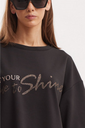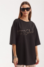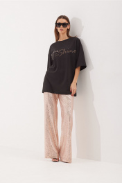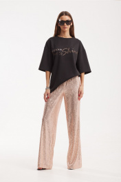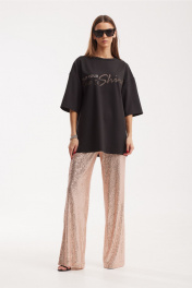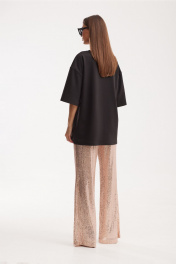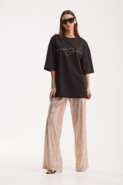 Комплект женский состоящий из блузы и брюк. Блуза прямой силуэтной формы, свободная «оверсайз» со спущенным плечом. Горловина округлой формы обработана притачной планкой. Перед и спинка цельные по низу с планкой и с разрезом по переду. Рукава одношовные до уровня локтя. На детали переда в области груди расположена печать. Блуза выполнена из трикотажного полотна. Брюки выполнены из трикотажного полотна-сетки с пайетками, покроены по косой. Верхний срез оформлен цельнокроеным поясом на резинке. На задних половинках расположены талиевые вытачки. Брюки прямые, слегка расширены книзу, полностью на подкладке. Блуза: Ширина изделия на уровне глубины: 42р – 54см, 44р – 56см, 46р – 58см, 48р – 60см, 50р – 62см, 52р – 64см; Ширина по линии талии: 42р – 50см, 44р – 52см, 46р – 54см, 48р – 56см, 50р – 58см, 52р – 60см; Ширина по линии бедер: 42р – 52см, 44р – 54см, 46р – 56см, 48р – 58см, 50р – 60см, 52р – 62м; Ширина рукава под проймой: 42 – 21см, 44 –21см, 46р – 21см, 48р – 23см, 50р – 23см, 52р – 23см; Ширина плеча от горловины: 42 – 21см, 44 –22см, 46р – 23см, 48р – 23см, 50р – 24см, 52р – 25см; Длина рукава от горловины: 42 – 47см, 44 –48см, 46р – 49см, 48р – 49см, 50р – 50см, 52р – 51см; Длина по среднему шву спинки: 42-46р – 73см, 48-52р – 74см. Брюки: Ширина по линии талии (без натяжения резинки): 42р – 31см, 44р – 33см, 46р – 35см, 48р – 37см, 50р – 39см, 52р – 41см; Ширина по линии бедер: 42р – 47см, 44р – 49см, 46р – 51см, 48р –53см, 50р – 55см, 52р – 57см; Длина по боковому шву с поясом: 42р-46р – 109см, 48р-52р – 110см. Ширина брючины внизу: 42р – 29см, 44р – 30см, 46р – 31см, 48р –32см, 50р – 33см, 52р – 34см; Высота посадки: 42р-46р – 34см, 48р-52р – 36см; Длина по внутреннему шву: 42р-46р – 82см, 48р-52р – 81см.