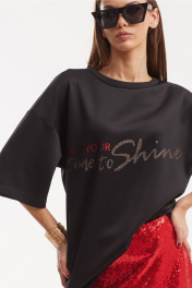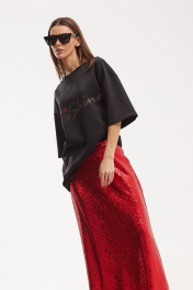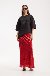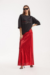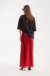 Комплект женский состоящий из блузы и юбки. Блуза прямой силуэтной формы, свободная «оверсайз» со спущенным плечом. Горловина округлой формы обработана притачной планкой. Перед и спинка цельные, по низу с планкой и с разрезом по переду. Рукава одношовные до уровня локтя. На детали переда в области груди расположена печать. Блуза выполнена из трикотажного полотна. Юбка выполнена на трикотажной подкладке, покроена по косой, книзу слегка расширена. Верхний срез переднего и заднего полотнища обработан обтачкой, на заднем полотнище расположены талиевые вытачки. В левом боковом шве застежка на потайную «тесьму-молнию». Блуза: Ширина изделия на уровне глубины: 42р – 54см, 44р – 56см, 46р – 58см, 48р – 60см, 50р – 62см, 52р – 64см; Ширина по линии талии: 42р – 50см, 44р – 52см, 46р – 54см, 48р – 56см, 50р – 58см, 52р – 60см; Ширина по линии бедер: 42р – 52см, 44р – 54см, 46р – 56см, 48р – 58см, 50р – 60см, 52р – 62м; Ширина рукава под проймой: 42 – 21см, 44 –21см, 46р – 21см, 48р – 23см, 50р – 23см, 52р – 23см; Ширина плеча от горловины: 42 – 21см, 44 –22см, 46р – 23см, 48р – 23см, 50р – 24см, 52р – 25см; Длина рукава от горловины: 42 – 47см, 44 –48см, 46р – 49см, 48р – 49см, 50р – 50см, 52р – 51см; Длина по среднему шву спинки: 42-46р – 73см, 48-52р – 74см. Юбка: Ширина по линии талии (без натяжения резинки): 42р – 33см, 44р – 35см, 46р – 37см, 48р – 39см, 50р – 41см, 52р – 43см; Ширина по линии бедер: 42р – 47см, 44р – 49см, 46р – 51см, 48р –53см, 50р – 55см, 52р – 57см; Длина по боковому шву: 42р-52р –104см.