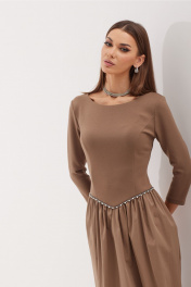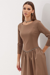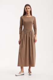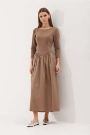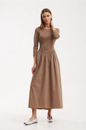 Платье женское полуприлегающего силуэта, втачного покроя. Платье выполнено из двух видов ткани: трикотажное полотно и костюмно-плательная ткань. Верхняя часть платья состоит из центральных частей переда, спинки и боковых частей. Подрез выполнен по спинке горизонтально, по переду в виде «клина». В шов подреза вставлена декоративная тесьма. Нижняя часть платья присборена по линии подреза, в боковых швах расположены карманы. По спинке средний шов, в котором расположены застежка на «тесьму-молнию» Горловина виде «лодочки». Рукав ¾ одношовный. Ширина изделия на уровне глубины: 42р – 43см, 44р – 45см, 46р – 47см, 48р – 49см; Ширина по линии талии: 42р – 34см, 44р – 36см, 46р – 38см, 48р – 50см; Ширина по линии бедер: 42р – 66см, 44р – 68см, 46р – 70см, 48р – 72см; Ширина рукава под проймой: 42 – 15см, 44 – 16см, 46р – 17см, 48р – 18см; Ширина плеча: 42-46р – 7см, 48р – 7,5см; Ширина спинки: 42-46р – 36см, 48– 38см; Длина рукава: 42-48р – 46см; Длина по среднему шву спинки: 42-48р – 130см.