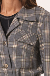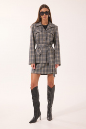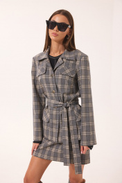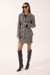 Комплект женский двухпредметный, состоящий из жакета и юбки, выполнен из ткани в клетку. Жакет прямого силуэта с центрально-бортовой застежкой на пуговицы. Спинка прямая. Воротник пиджачного типа. Рукав длинный, одношовный, втачной. По переду жакета расположены нагрудные вытачки, идущие из бокового шва. По низу переда – накладные карманы с клапаном (клапан выполнен по косой). В верхней части переда настрочен отделочный клапан (по косой). Застежка до верха, с отложным воротником. В комплект входит съемный пояс. Юбка прямая, длина мини, с вытачками по переднему и заднему полотнищу. Верхний срез юбки обработан поясом. Юбка выполнена на подкладке. На заднем полотнище расположен средний шов с застежкой «молния», по поясу – на петлю-пуговицу. Жакет: Ширина изделия на уровне глубины: 42р – 47см, 44р – 49см, 46р – 51см, 48р – 53см, 50р – 55см, 52р – 57см; Ширина по линии бедер: 42р – 50см, 44р – 52см, 46р – 54см, 48р – 56см, 50р – 58см, 52р –60см; Длина по среднему шву спинки: 42р – 69см, 44р – 69см, 46р – 69см, 48р – 71см, 50р – 71см, 52р – 71см; Ширина спинки: 42-46р – 37см, 48-52р – 40см; Ширина плеча: 42р – 14см, 44р – 14см, 46р – 14см, 48 – 15,3см, 50 – 15,3см, 52 – 15,3см; Ширина рукава под проймой: 42р – 17см, 44р – 18см, 46р – 19см, 48р – 19,5см, 50р – 20,5см, 52р – 21,5см; Длина рукава: 42-52р – 62см; Длина ремня: 42-46р – 196см, 48-52р – 208 см. Юбка: Ширина по линии талии: 42р – 34см, 44р – 36см, 46р – 38см, 48р – 40см, 50р – 42см, 52р – 44см; Ширина по линии бедер: 42р – 47см, 44р – 49см, 46р – 51см, 48р – 53см, 50р – 55см, 52р – 57см; Длина по боковому шву: 42-46р – 42см, 48-52р – 44см.