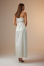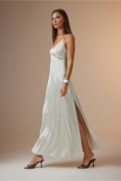 Платье женское, полуприлегающего силуэта, расширенное к низу, длинное с высоким разрезом в левом боковом шве. Платье отрезное под грудью, соединено с верхней частью частично по боковым швам и точечно по центру переда. Верхние части переда и спинки имеют рельефные линии. Платье с У-образным вырезом на брителях с регуляторами длины. В левый боковой шов вставлена потайная молния. Платье выполнено из атласной ткани. Ширина изделия на уровне глубины: 42р – 40см, 44р – 42см, 46р – 44см; Ширина по линии уровня подреза: 42р – 34см, 44р – 36см, 46р – 38см; Ширина по линии бедер: 42р – 47см, 44р – 49см, 46р – 51см; Длина по среднему шву спинки: 42-46р – 119см.
