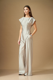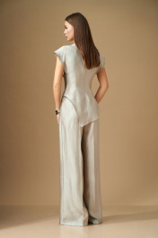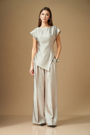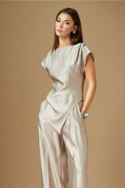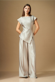 Комплект женский, состоит из блузы, брюк Блуза: приталенного силуэта, со спущенным плечом. В плечевых швах по переду две складки. По переду и спинке талиевые вытачки. Низ изделия имеет фигурную, ассиметричную форму. По спинке средний шов, в который вставлена потайная молния. Брюки свободной формы с манжетами, слегка расширены книзу. Верхний срез оформлен цельнокроеным поясом. В боковых швах передних половинках расположены наклонные карманы. В брюках заутюжены стрелки. На передних половинках расположены складки, направленные к боковому шву, на задней правой половинке расположена «имитация» кармана в рамку с пуговицей, а так же талиевые вытачки. На передних половинках застежка на гульфик. Блуза: Ширина изделия на уровне глубины: 42р – 44см, 44р – 46см, 46р – 48см, 48р – 50см, 50р – 2см, 52р – 54см; Ширина по линии талии: 42р – 36см, 44р – 38см, 46р – 40см, 48р – 42см, 50р – 44см, 52р – 46см; Длина по среднему шву спинки: 42р – 68см, 44р – 68см, 46р – 68см, 48р – 70см, 50р – 70см, 52р – 70см; Ширина плеча: 42р – 17см, 44р – 18см, 46р – 19см, 48 – 19см, 50р – 20см, 52р – 21см; Брюки: Ширина по линии талии (без натяжения резинки): 42р – 33см, 44р – 35см, 46р – 37см, 48р – 39см, 50р – 41см, 52р – 43см; Ширина по линии бедер: 42р – 53см, 44р – 55см, 46р – 57см, 48р –59см, 50р – 61см, 52р – 63см; Длина по боковому шву с поясом: 42р-46р – 112см, 48р-52р – 112см; Ширина брючины внизу: 42р – 36см, 44р – 37см, 46р – 37см, 48р –38см, 50р – 39см, 52р – 40см; Высота посадки: 42р-46р – 37см, 48р-52р – 38см; Длина по внутреннему шву: 42р-46р – 83см, 48р-52р – 82см.
