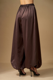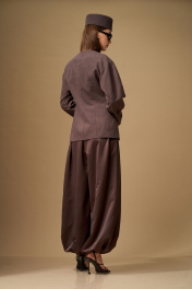 Комплект женский трехпредметный: жакет и брюки и топ-бандо. Жакет прилегающего силуэта со спущенным плечом, с центрально-бортовой застежкой на одну пуговицу в области талии. Горловина У-образной формы с расходящимся закругленным краем борта внизу. По переду рельеф от плеча, переходящий в подрез, в котором выполнены карманы в рамку. На правой центральной части сверху выполнена два кармана в рамку разной длины (имитация). Спинка со средним швом и двумя рельефами от плеча. Рукав длинный, двухшовный, снизу с вытачкой, для увеличения объема рукава в верхней части. Жакет на подкладке. Топ-бандо выполнен из трикотажного полотна, приталенного силуэта, без брителей. Брюки свободной формы, с низкой посадкой, сильно расширенные и собранные снизу на резинку. Верхний срез обработан поясом на резинке, центральная часть переда без резинки. Брюки по силуэту называются «алладины». Фурнитура может отличаться от фото, не изменяя художественному образу. Жакет: Ширина изделия на уровне глубины: 42р – 45см, 44р – 47см, 46р – 49см, 48р – 51см, 50р – 53см, 52р – 55см; Ширина по линии талии: 42р – 38см, 44р – 40см, 46р – 42см, 48р – 44см, 50р – 46см, 52р – 48см; Ширина по линии бедер: 42р – 48,5см, 44р – 50,5см, 46р – 52,5см, 48р – 54,5см, 50р – 56,5см, 52р – 58,5см; Длина по среднему шву спинки: 42р – 66см, 44р – 66см, 46р – 66см, 48р – 68см, 50р – 68см, 52р – 68см; Ширина плеча: 42р – 18см, 44р – 19см, 46р – 20см, 48 – 20см, 50р – 21см, 52р – 22см; Ширина рукава под проймой: 42-46р – 21см, 48-52р – 23см; Длина рукава от плеча: 42р-52р – 73 см. Топ-бандо: Ширина изделия на уровне глубины: 42р – 32см, 44р – 34см, 46р – 36см, 48р – 38см, 50р – 40см, 52р – 42см; Ширина по линии низа: 42р – 30см, 44р – 32см, 46р – 34см, 48р – 36см, 50р – 38см, 52р – 40см; Длина по среднему шву спинки: 42-46р – 18см, 48-52р – 19см. Брюки: Ширина по линии талии: 42р – 31см, 44р – 33см, 46р – 35см, 48р – 37см, 50р – 39см, 52р – 41см; Ширина по линии бедер: 42р – 66см, 44р – 68см, 46р – 70см, 48р – 72см, 50р – 74см, 52р – 76см; Длина по боковому шву: 42р – 106см, 44р – 106см, 46р – 106см, 48р – 106см, 50р – 106см, 52р – 106см; Высота посадки: 42-46р – 36см, 48-52р – 37см; Длина по внутреннему шву: 42-46р – 81см, 48-52р – 80см.