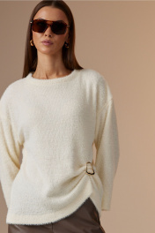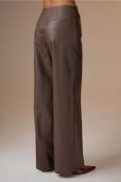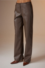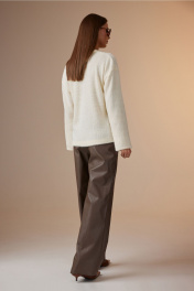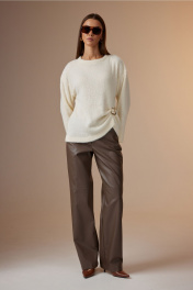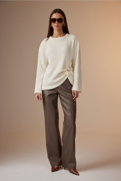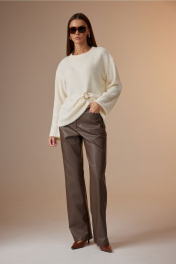 Джемпер выполнен из трикотажного полотна (мохер). Джемпер прямого силуэта, со спущенным плечом. По горловине переда и спинки пришита бейка из основной ткани, Рукав одношовный, длинный, прямой. Низ переда с левой стороны собирается в драпировку с помощью отделочной броши. Брюки выполнены из экокожи. Брюки прямого силуэта, с горизонтальными подрезами на уровне колена. Верхний срез брюк обработан обтачками. На передних половинках выполнены карманы виде фигурных подрезов. На правой задней половинке выполнен прорезной карман с листочкой (имитация). Застежка на тесьму-молнию и маленькую кнопку. Блуза: Ширина изделия на уровне глубины: 42р – 47см, 44р – 49см, 46р – 51см, 48р – 53см, 50р – 55см, 52р – 57см; Ширина по линии бедер: 42р –48см, 44р – 50см, 46р – 52см, 48р – 54см, 50р – 56см, 52р – 58см; Длина по среднему шву спинки: 42р-46р – 62см, 48-52р – 65см; Ширина плеча: 42р –18см, 44р – 19см, 46р – 20см, 48р – 20см, 50р – 21см, 52р – 22см; Ширина рукава под проймой: 42р-46р – 19см, 48-52р – 21см; Длина рукава: 42р-46р – 46см, 48-52р – 46см. Брюки: Ширина по линии талии: 42р – 33см, 44р – 35см, 46 – 37см, 48р – 39см, 50р – 41см, 52р – 43см; Ширина по линии бедер: 42р – 46см, 44р – 46см, 46р – 50см, 48р – 52см, 50р – 54см, 52р – 56см; Длина по боковому шву: 42-46р – 107см; 48-52р – 107см; Длина по внутреннему шву: 42-46р – 85см; 48-52р – 84см; Высота посадки: 42-46р – 27см; 48-52р – 28см; Ширина брюк внизу: 42р – 24см, 44р – 25см, 46р – 26см, 48р – 26см, 50р – 27см, 52р – 28см.
