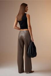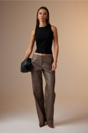Брюки выполнены из экокожи. Брюки прямого силуэта, с горизонтальными подрезами на уровне колена. Верхний срез брюк обработан обтачками. На передних половинках выполнены карманы виде фигурных подрезов. На правой задней половинке выполнен прорезной карман с листочкой (имитация). Застежка на тесьму-молнию и маленькую кнопку. Ширина по линии талии: 42р – 33см, 44р – 35см, 46 – 37см, 48р – 39см, 50р – 41см, 52р – 43см; Ширина по линии бедер: 42р – 46см, 44р – 46см, 46р – 50см, 48р – 52см, 50р – 54см, 52р – 56см; Длина по боковому шву: 42-46р – 107см; 48-52р – 107см; Длина по внутреннему шву: 42-46р – 85см; 48-52р – 84см; Высота посадки: 42-46р – 27см; 48-52р – 28см; Ширина брюк внизу: 42р – 24см, 44р – 25см, 46р – 26см, 48р – 26см, 50р – 27см, 52р – 28см.