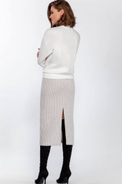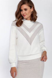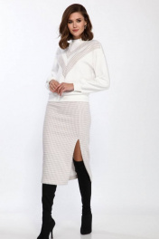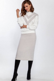 Костюм женский выполнен из мягкой трикотажной ткани. Джемпер прямого силуэта с втачными рукавами. На детали переда по центру вставки фигурной формы из отделочной ткани. Рукава втачные одношовные, с притачными манжетами. Вырез горловины округлой формы. Юбка из трикотажного полотна, на эластичной резинке. Расположение разреза можно менять: сбоку или сзади! <br /> Джемпер: длина рукава - 50,5-51 см, ширина рукава - 22 см, длина спинки - 59-61 см. <br /> Юбка: длина - 70 см