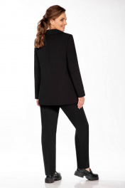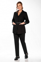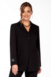 Комплект женский (жакет и брюки). Жакет прямого силуэта, на подкладке, с центральной застёжкой на 2 кнопки и супатную застежку на 3 петли и 3 пуговицы до линии перегиба лацкана. Детали переда с талиевыми и нагрудными вытачками, с двумя накладными карманами. Спинка жакета со средним и рельефными швами. Рукава втачные двухшовные, с передним и локтевым швами. На правом рукаве понизу нанесена декоративная печать. Воротник отложной пиджачного типа. Брюки зауженные к низу, с притачным поясом, по спинке пояса вставлена эластичная тесьма. Застежка на тесьмумолнию и 1 потайной крючок. На передних половинках брюк обработаны по 1 вытачке в боковых швах обработаны наклонные карманы. На задних частях брюк обработаны по 1 вытачке на каждой половинке. На передних и задних половинках брюк заутюжены «канты». На поясе прикреплены 5 шлёвок. Длина изделия Жакет: длина спинки – 74см. Брюки: длина по боковому шву – 98см. Длина рукава Жакет: длина рукава - 61см, ширина рукава – 20,5см.