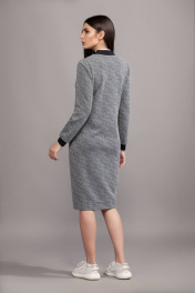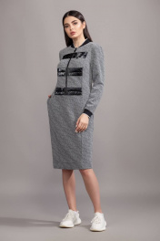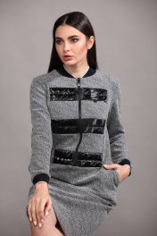 Платье женское из трикотажной ткани в стиле""спорт-шик"" с воротником-стойкой. В боковых швах обработаны функциональные карманы. Центральная часть переда с застежкой на тесьму-молнию, с 3-мя горизонтальными подрезами и вставками из отделочной ткани. Рукава втачные одношовные, с притачными манжетами. Платье: длина рукава - 58см, ширина рукава – 18см, длина спинки – 104см.
