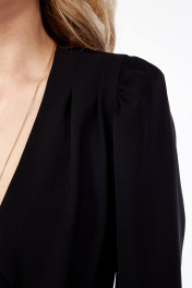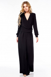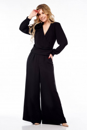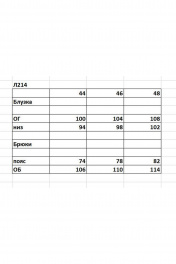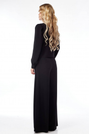 Легкий стильный костюм из струящейся ткани, состоящий из блузки и брюк. Блузка на фиксированный запах, в верхней части складки от плечевых швов, справа декор- обьемный сьемный цветок. Рукав втачной, широкий, на манжете. Брюки-палаццо широкие на поясе, застежка на 2 пуговицы и тесьму молнию, боковые карманы и складки от пояса. Длина блузки 49см, длина рукава 61см, длина брюк с учетом пояса 110см.