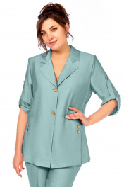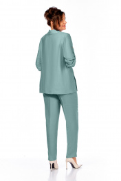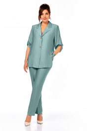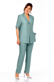 Жакет полуприлегающего силуэта, с пиджачным воротником, застежка на две пуговицы. На полочке шлицы с декоративными шлицами. Спинка со средним швом. Рукав втачной, длиной три четверти, регулируется патой. Брюки прямые, пояс на резинке, карманы в боковых швах. Длина жакета 70см, длина рукава 47см. Длина брюк 109см