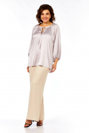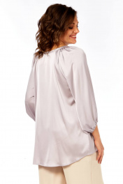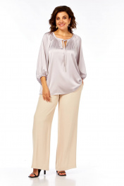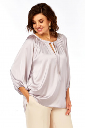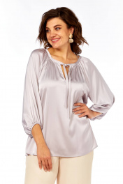 Блузка свободного силуэта, рукав реглан. Горловина обработана планкой, переходящей в завязку. По переду и спинке сборка в верхней части. Рукав длиной 7/8 на резинке. Длина блузки 70см