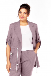 Летний комплект состоящий из жакета, брюк и блузы. Жакет прямого силуэта с пиджачным воротником, без подкладки и без застежки. По бокам накладные карманы с клапанами. На правом клапане декоративная нашивка. По талии кулиска. Рукава втачные, длиной три четверти с патами. Брюки прямые, зауженные к низу, с отворотом, пояс притачной на эластичной тесьме с кулиской, боковые карманы . Блуза прямого силуэта, рукав короткий. Длина блузы 73 см, длина жакета 74 см, длина рукава жакета 48 см, длина брюк 100 см 50 52 54 56 58 60 жакет ОГ 112 116 120 124 128 132 ОБ 116 120 124 128 132 136 брюки пояс 74 78 82 86 90 94 ОБ 118 122 126 130 134 138