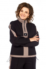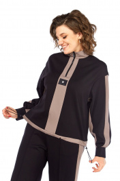 Костюм женский спорт-шик. Джемпер прямого силуэта, со спущенным рукавом. Воротник-стойка из отделочной ткани, планка по центру, в которой вставлена молния, декаротивная нашивка. Рукав с планками из отделочной ткани и декоративные защипы на манжетах. По низу кулиска с фиксаторами. Брюки прямые, по переду застрочены стрелки, по внешней стороне отделочные детали с разрезами по низу. Карманы в боковых швах, пояс на резинке. Длина джемпера 60см с воротником, длина рукава от плеча 75см. Длина брюк 109см С948 50 52 54 56 джемпер ОГ 122 126 130 134 брюки пояс 76 80 84 88 ОБ 113 117 121 125