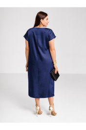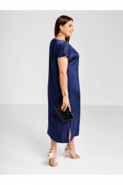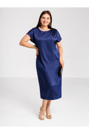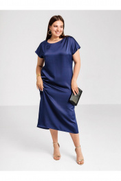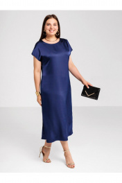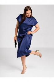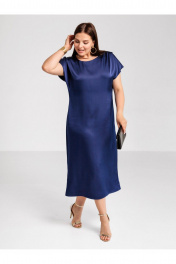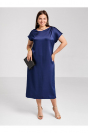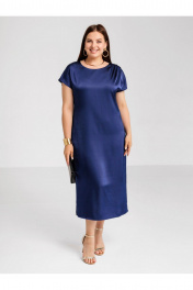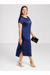 Платье женское прямого силуэта. Длина миди. Модель изготовлена из струящегося текстиля с мягким, благородным блеском. Рукава цельнокроёные, короткие. Вырез горловины слегка округлый. По левому плечу декоративный узел в виде мягких складок, плавно спускающихся на выпуклость груди. По правой стороне внизу - игривый разрез. Платье прекрасно подойдёт для торжественных мероприятий и станет изюминкой любого гардероба.