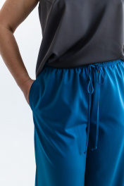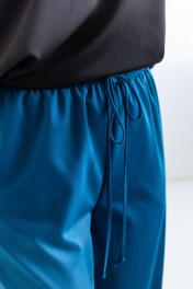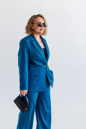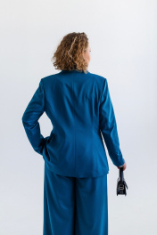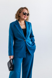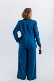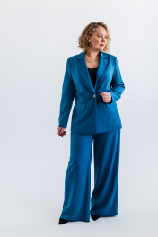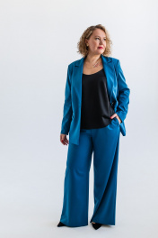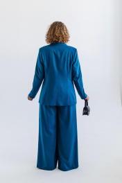 Костюм женский, состоящий из жакета и брюк. Модель выполнена из костюмной ткани с содержанием вискозы в составе, эффектного цвета морской волны. Жакет полуприлегающего силуэта, с плавным приталиванием. Изделие на подкладке. Воротник пиджачного типа с фигурными лацканими. Вытачки по переду от линии прорезных карманов и дополнительный рельеф для лучшей посадки по фигуре. Карманы с клапанами, край клапана и низ изделия с плавным скруглением по модели. Застёжка центральная на петлю и пуговицу. Стильная металлическая пуговица под серебро, гармонично завершает образ. Рукав втачной, длинный. Спинка со средним швом и вертикальными подрезами. Брюки широкие на резинке по поясу. Без подкладки. Для лучшего прилегания в области талии, по поясу предусмотрена кулиса. Костюм подойдёт как база для создания образов в разных стилях и хорошо сочетается с различной обувью.