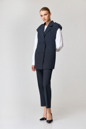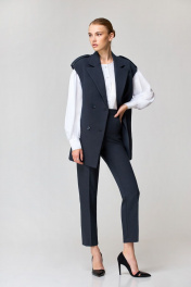 Комплект женский полуприлегающего силуэта, состоящий из жилета, блузы, брюк. Жилет и брюки выполнены из костюмной, однотонной ткани. Блуза выполнена из однотонной блузочной ткани. Жилет двубортный со спущенным плечом, на переду расположены вертикальные карманы в шве притачивания бочка, выточки нагрудные направлены от шва притачивания бочка. На спинке расположена горизонтально-направленная кокетка и средний шов. Горловина оформлена воротником пиджачного типа. В области плеча расположены паты «идущие» от проймы и фиксирующиеся на пуговицу. Брюки классической формы к низу заужены. На передних и задних половинках заутюжены стрелки. Верхний срез обработан поясом. В поясе расположена резинка от карманов и по задним половинкам. На переде расположены наклонные карманы. На задних половинках расположены талевые вытачки. Блуза полуприлегающего силуэта, горловина округлой формы. Покрой спущенное плечо. Рукава объемные со сборкой по окату и по нижнему срезу, низ рукава оформлен манжетой на две пуговицы. Длина жакета по спинке: 75 см Длина рукава блузки: 77 см Длина брюк – 97см.