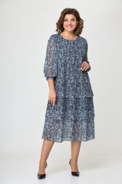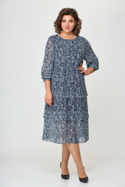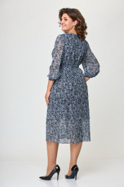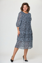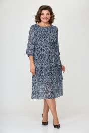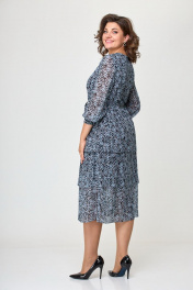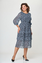 Платье женское А-образного силуэта, втачного покроя. Платье выполнено из шифона на трикотажной подкладке. Горловина округлой формы, рукава трехчетвертные со сборкой по низу, на манжету на одну пуговицу. Платье состоит из отрезных воланов по переду и по спинке повторяющих силуэт изделия. На переде расположены нагрудные вытачки. Дополнением к платью служит пояс из основной ткани с помощью которого можно его приталить. Длина по спинке: 114 см Длина рукава: 51см