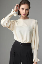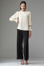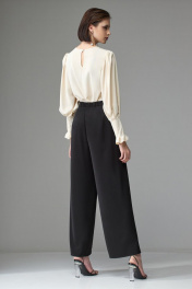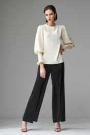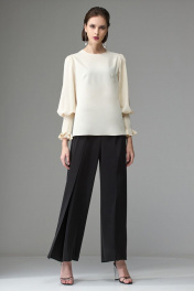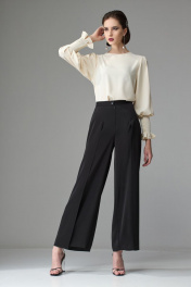 Брюки прямого силуэта, выполнены из вискозной струящейся ткани. При ходьбе верхняя часть брюк развивается, что придает образу легкость и женственность. Верхний срез брюк обработан поясом, застежка по переду на потайную молнию. По спинке в поясе расположена резинка для более комфортной посадки. На задних половинках расположены вытачки. На передних половинках также расположены вытачки, в которые вставлена верхняя часть брюк, далее она же зафиксирована, что создает эффект верхнего свободно-разлетающегося полотна. Ширина по линии талии: 44р – 34см, 46р – 36см, 48р – 38см Ширина по линии бедер: 44р – 50см, 46р – 52см, 48р – 54см Длина по боковому шву: 44р – 104см, 46р – 104см, 48р – 104см Ширина брючины внизу: 44р – 25,5см, 46р – 26,5см, 48р – 27,5см Высота посадки: 44р – 34см, 46р – 34см, 48р – 34см Длина по внутреннему шву: 44р – 75см, 46р – 75см, 48р – 75см